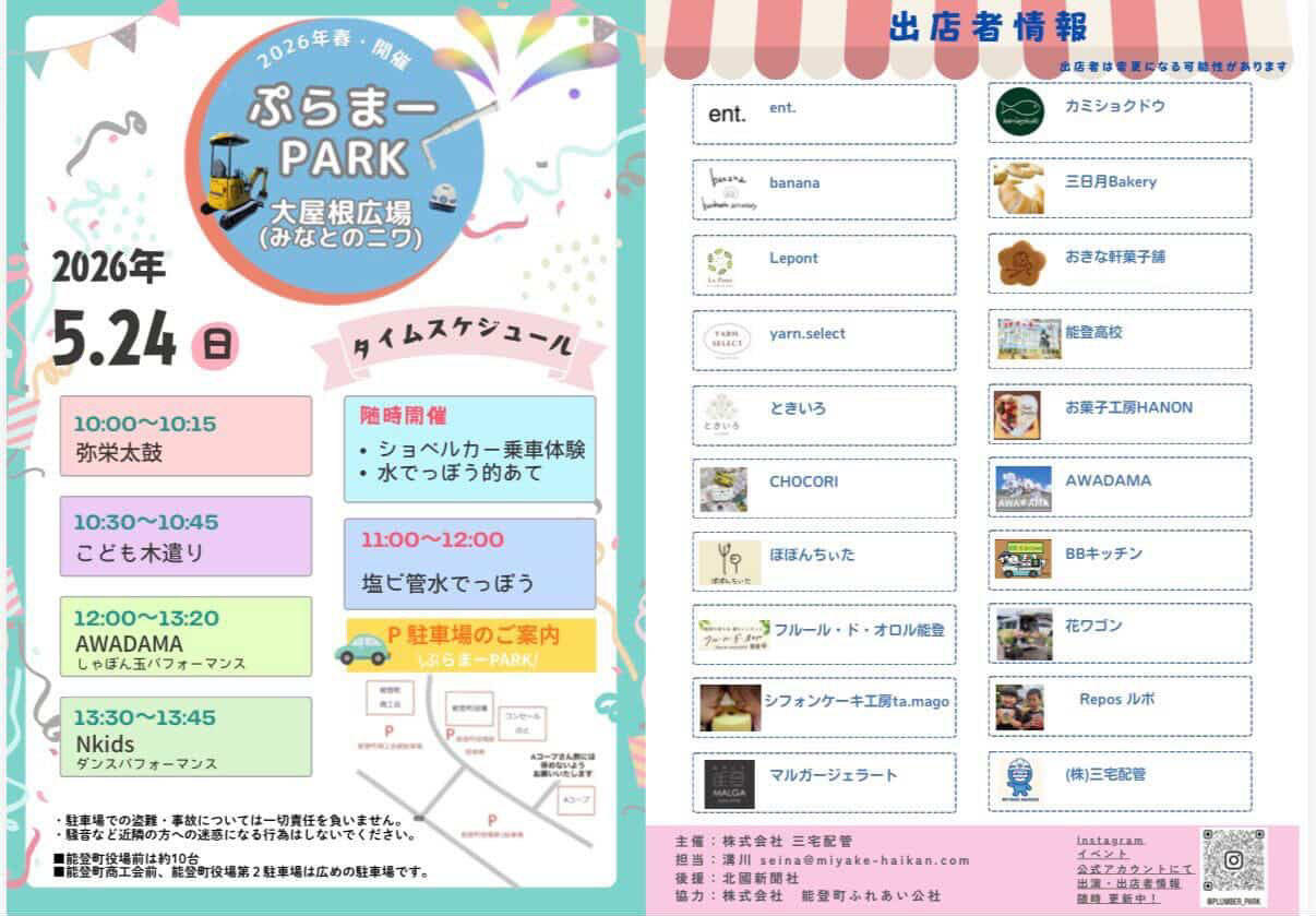 5月24日に行われる「ぷらまーPARK」に出店が決まりましたので、まだ先ですがご報告します。場所は能登町大屋根広場いやさか広場にて行われます。