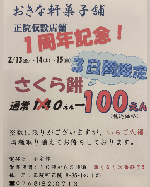 おかげさまで、当店は2月14日をまちまして仮設店舗開業1周年を迎えることができました。これもひとえに皆様のご支援の賜物と深く感謝申し上げます。今後とも変わらぬご愛顧を賜りますよう、お願い申し上げます。