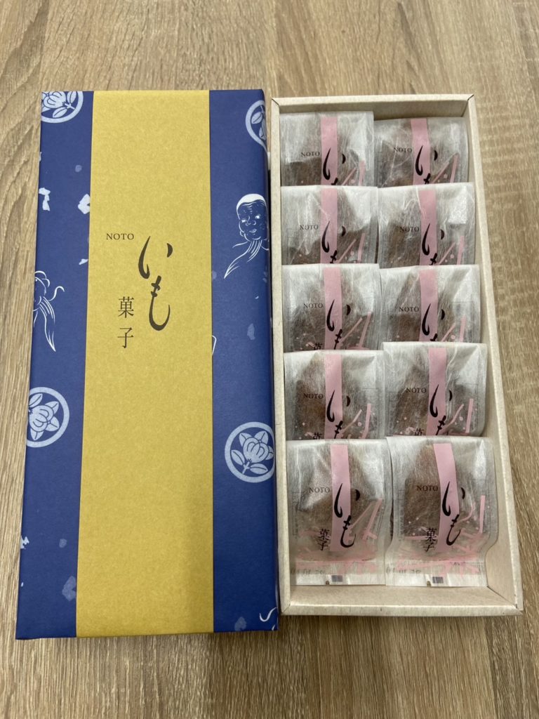 奥能登地方で作られた100年以上の伝統ある和菓子です。多くの和菓子屋が作っており、お店によって餡子の味などが変わりますが、おきな軒菓子舗では、サツマイモの形をしたニッキ(シナモン)風味のお菓子で、白餡と五郎島金時を合わせて炊いた餡子を使用しています。ご希望に合わせて箱詰めを行っています。
